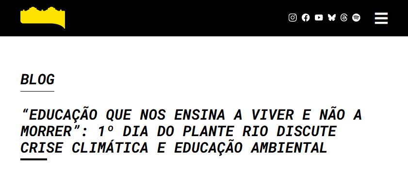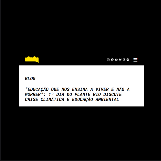 O blog da Fundição Progresso publicou sobre a 7ª edição do evento Plante Rio, do qual participou a doutoranda Rita Passos. Rita participou da roda de conversa “Colapso Climático: desafios globais e locais”,, mediada por Sergio Portella e que contou também com a presença de Celso Sanchez (UNIRIO) e Eduardo Sá Barreto (UFF), que debateram os impactos sociais e ambientais da crise climática e os caminhos possíveis de resistência. Em suas falas, os participantes destacaram a urgência de ações transformadoras frente ao colapso ambiental, o papel da educação ambiental crítica e a importância de articular a luta antirracista às agendas ambientais contemporâneas. Veja a notícia completa em:  https://www.fundicaoprogresso.com.br/Blog/Detalhes/1096